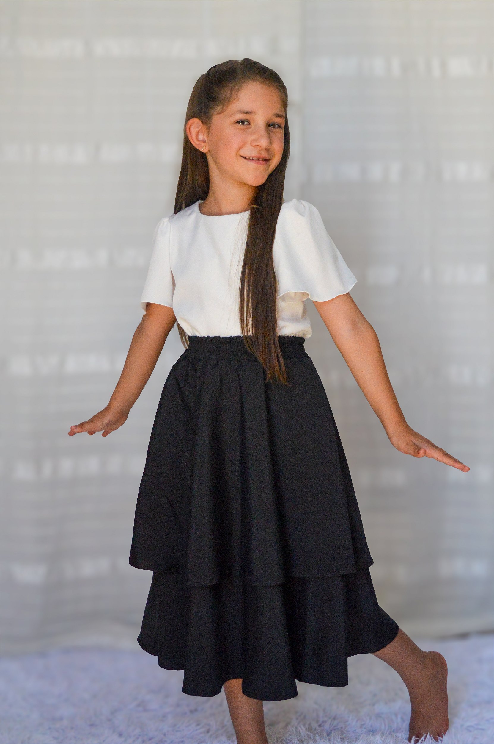 A nossa saia dupla preta é delicada, elegante e pensada para acompanhar a beleza da infância com modéstia, essa saia infantil é confeccionada em crepe leve e fluido, proporcionando caimento suave e movimento encantador a cada passo.