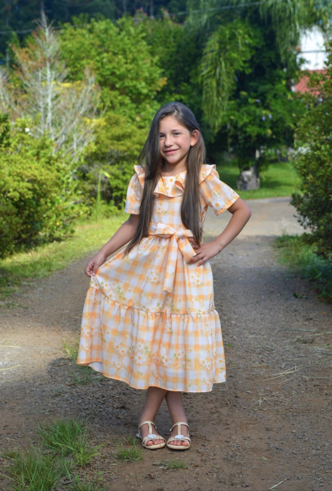 O Vestido Doce Primavera é uma celebração da delicadeza. Seu xadrez suave em tom claro, adornado com pequenas margaridas, traz um ar campestre, doce e atemporal ao visual. Desenvolvido para unir elegância e conforto, permite que a criança brinque, caminhe e se movimente com leveza e discrição.